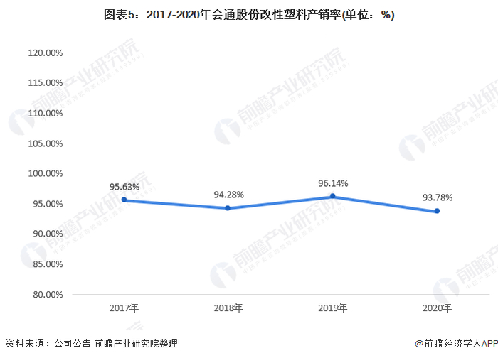 从改性塑料细分产品产销率来看, 2017-2020年改性塑料的产销率分别为95.63%、94.28%、96.14%和93.78%,整体呈现下降趋势。目前,公司改性塑料产品处于产能过剩的状态。