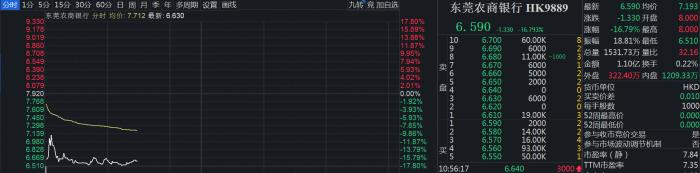 21世纪经济报道记者 叶麦穗 广州报道 东莞农商银行上市首日破发,盘中跌幅超过17%,10点50分左右,报6.54港元/股。 不过,下午开盘后股价回升,截至发稿,跌幅收窄至7%左右。