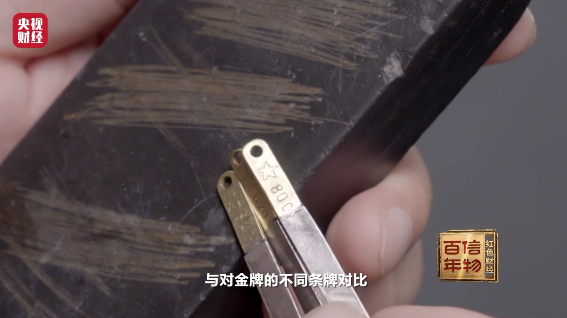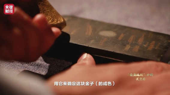 拿着黄金在试金石划出痕迹,与对金牌的不同条牌对比,通过肉眼就可以看出这块黄金的纯度成色,这是一种非常传统的黄金测试法。