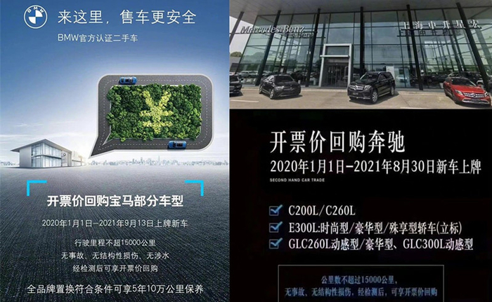 近段时间,几张来自宝马、奔驰官方二手车经销商回收的宣传单页在朋友圈内疯传。根据单页上的内容显示,商家以开票价(购车原价)回收部分车型的二手车。