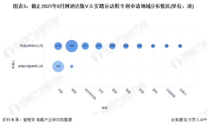 目前,阿迪达斯和安踏的运动鞋专利申请区域集中在中美两地,阿迪达斯在美国和中国申请的运动鞋专利数量分别为795项和379项。安踏运动鞋专利申请区域集中在中国,其运动鞋专利申请数量为729项。