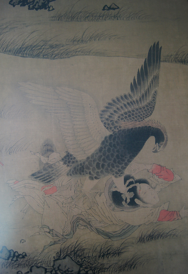 藏于北京故宫博物院的《搜山图》局部,最初标为元人作品,现一般认为是南宋画。画面描绘一群凶神恶煞正在满山追杀妖怪,妖怪大多作宋贵妇人装扮,追捕屠杀者穿着辽金的异族服饰。