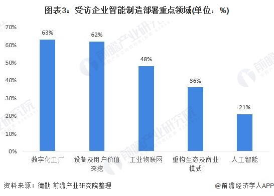 根据德勤调查发现,中国工业企业智能制造五大部署重点依次为:数字化工厂(63%)、设备及用户价值深挖(62%)、工业物联网(48%)、重构生态及商业模式(36%)以及人工智能(21%)。