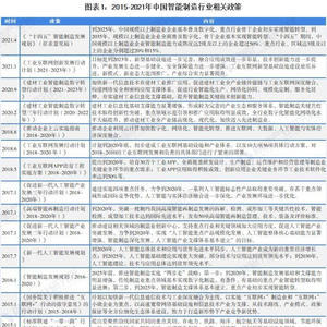 我国智能制造的发展起步较晚,最近几年政府发布了一系列政策推动智能制造的发展。2015年,国务院印发的《中国制造2025》是我国实施制造强国战略第一个十年的行动纲领,并随后出台了11个配套的实施指南、行动指南和发展规划指南,顶层设计已基本完成,全面转入实施阶段。从《中国制造2025》再到《“十四五”智能制造发展规划》(征求意见稿)的发布,都是以发展先进制造业为核心目标,布局规划制造强国的推进路径。我国我国智能制造行业相关政策如下: