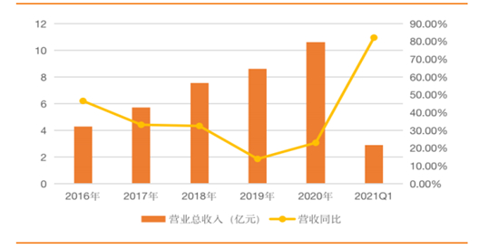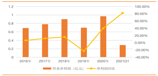 公司业绩近年持续增长。2016 年-2021Q1,光伏组件自动化生产线业务推动公司营收/净利润平稳增长。