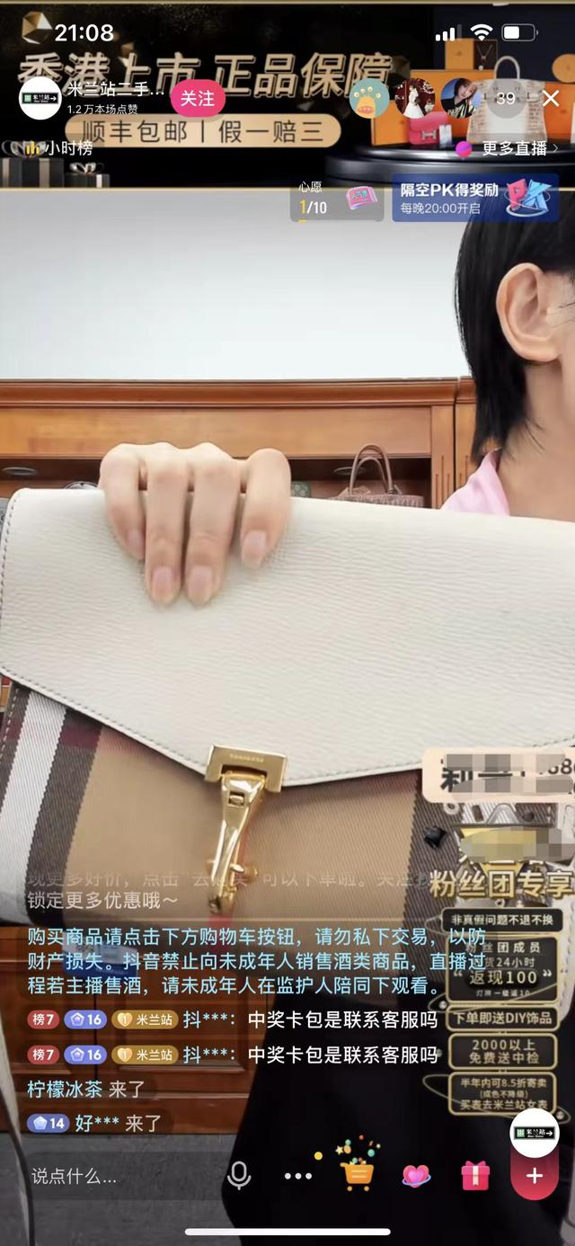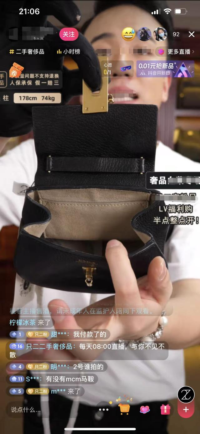 “包只有一个”“公价2.6万元,这款95新只要8400元”。抖音直播间里,主播正拿着一款LV背包,不断将各处细节进行展示,同时详细地为镜头另一端的粉丝讲解着。