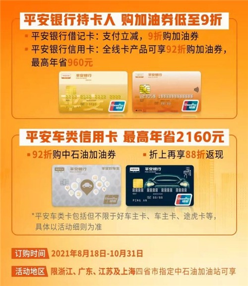上海、江苏、浙江、广东还没订购加油券的朋友,别犹豫啦!早订购早省钱!其他地区的朋友也可以先拿下平安好车主卡,享受加油88折,国庆自驾嗨起来!