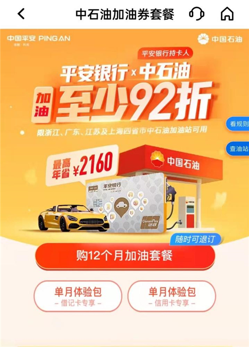 看到这里有些朋友可能会说,必须一次性订购一年么?当然不是,平安银行专门推出了借记卡/信用卡中石油加油专属1个月体验包,用得好再订购全年套餐!