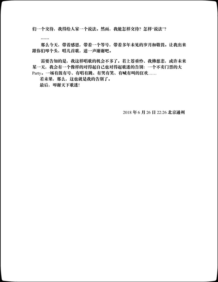 他从《我是不是你最疼爱的人》开始唱,“先把你们认为必唱的唱了吧,省得一会儿唱不动了。”气息弱,兴致也不高,琴弹得顿挫,就像叹息。唱了两首,他还没进入状态。“找不到一首高兴的歌儿来唱,高兴不起来啊。”
