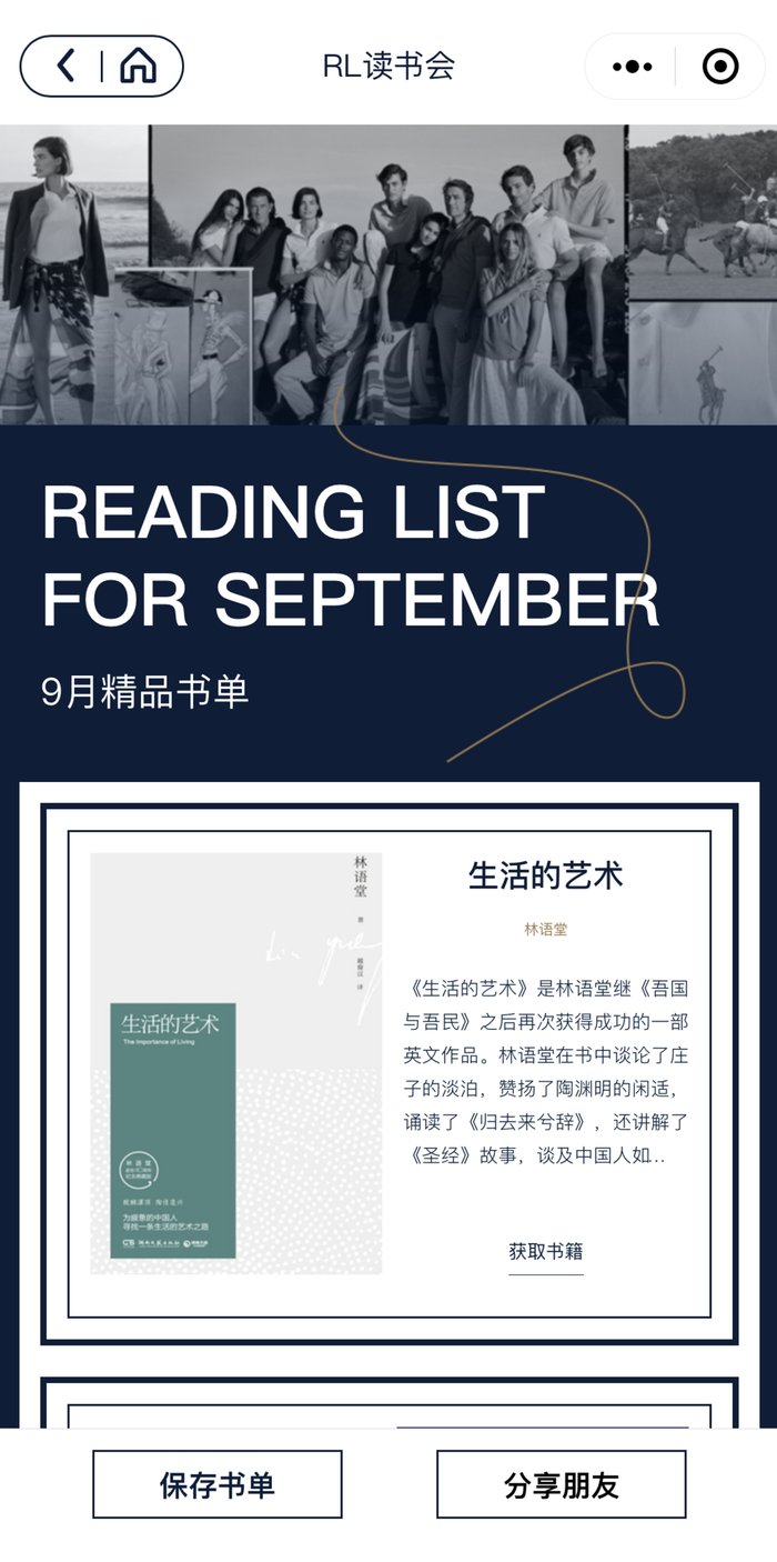 而社交裂变方面,拉夫劳伦这次也在智慧门店中做了丰富的尝试。例如“RL读书会”功能会每月推荐精品书单,注册小程序会员后可以获得微信读书的优惠权益,跳转至微信读书App激活使用,书单还可以直接分享给微信好友。同时,书单也配有风格相关联的商品,点击可以直接跳转商品页购买。
