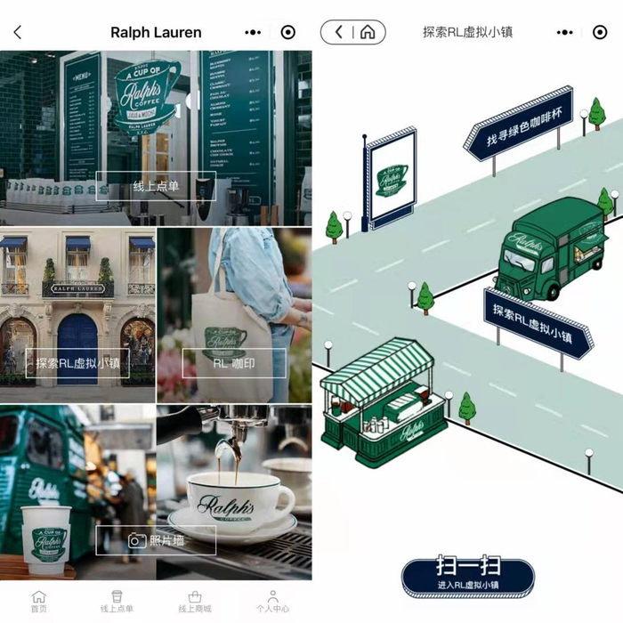 小程序首页呈现了三大模块,包括店内功能区域和线上体验的“拉夫劳伦之家”、“Ralph’s Coffee”和“Ralph Lauren官方商城”小程序入口。