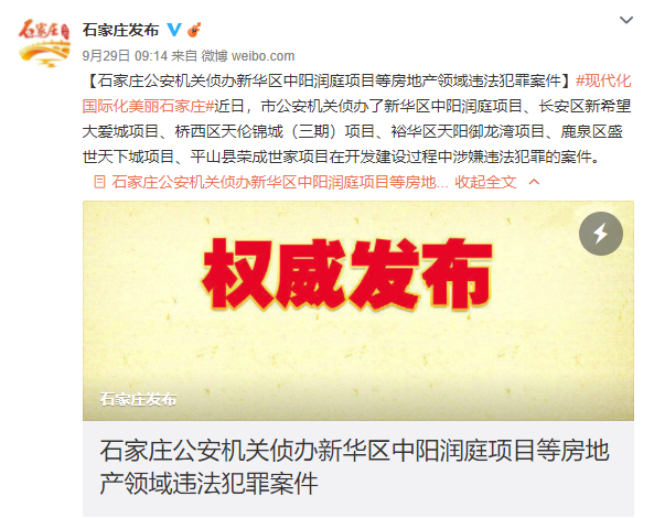 据“石家庄发布”9月29日发布的消息,近日,石家庄公安局侦办了新华区中阳润庭项目、长安区新希望大爱城项目、桥西区天伦锦城(三期)项目、裕华区天阳御龙湾项目、鹿泉区盛世天下城项目、平山县荣成世家项目在开发建设过程中涉嫌违法犯罪的案件。