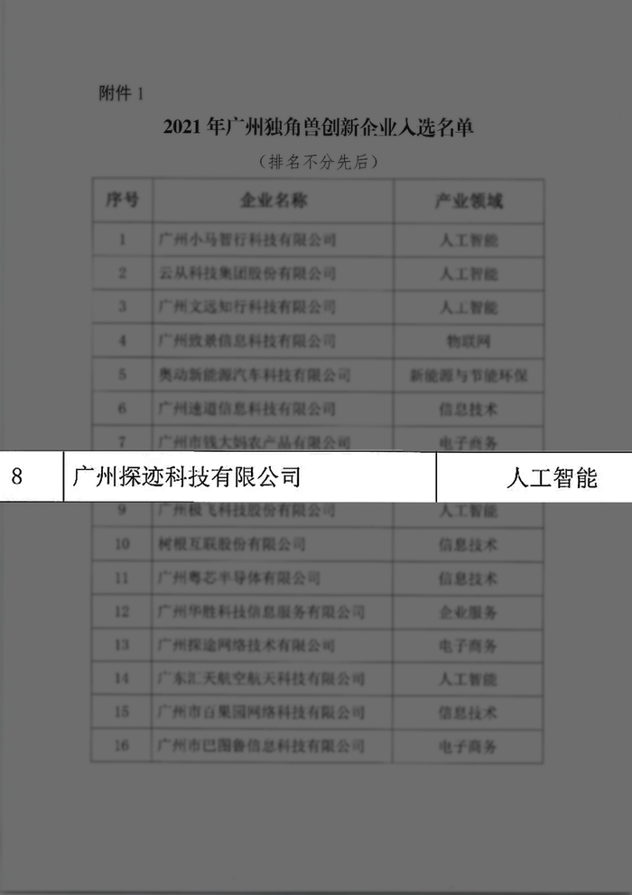 9月30日,由广州市科学技术局指导,广州市科技创新企业协会主办的《2021年广州“独角兽”创新企业榜单》正式公布,探迹科技新斩获广州“独角兽”企业称号——整个广州市仅入围16家“独角兽”企业,独角兽企业是指公司成立不超过10年,且估值超过10亿美元,市场潜力无限的企业。