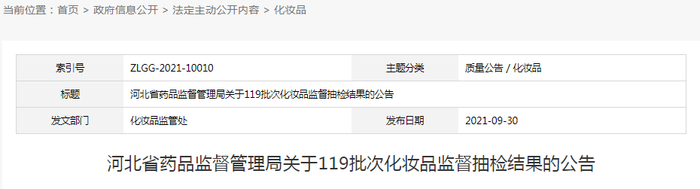 原标题:河北省药品监督管理局关于119批次化妆品监督抽检结果的公告