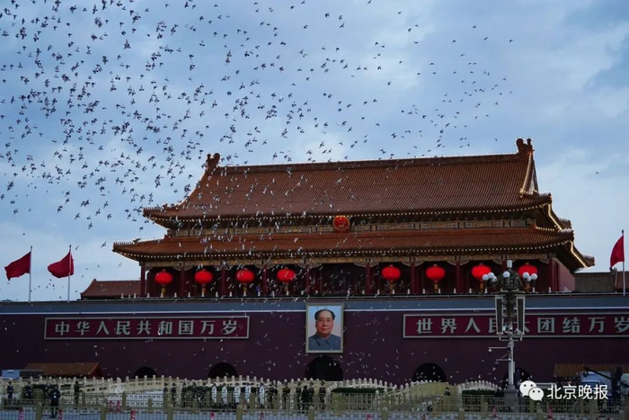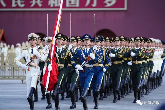 随着一声“正步走”的口令,96名三军仪仗队护旗编队以铿锵有力的正步步伐,走过城楼中央、金水桥。
