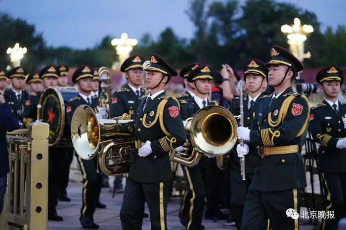 6点整,军乐团在旗杆周边就位。6时06分,城楼吹响升旗号角,升国旗仪式正式开始!观众们把手机、相机纷纷对准远处的城楼,将这激动人心的一刻记录下来。