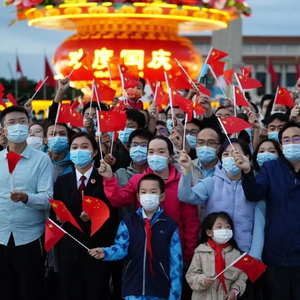 凌晨2点,华灯倒映下的长安街已经十分热闹,来自四面八方的群众陆续来到天安门广场周边。有的戴着“中国红”口罩,有的手持小国旗,还有的在脸上印着国旗的图案。大家自觉拉开安全距离,有序排队等候,安检入场,一切井然有序。