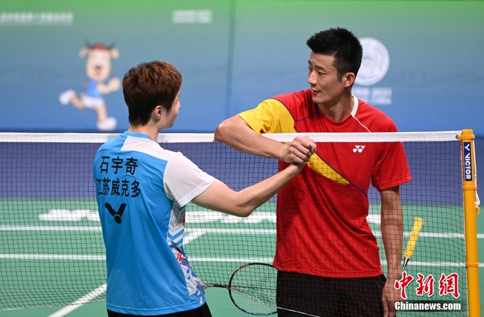 9月16日,在西安举行的第十四届全运会羽毛球男子单打半决赛中,福建队选手谌龙不敌江苏选手石宇奇,未能进入决赛。图为赛后谌龙与石宇奇握手。中新社记者 毛建军 摄