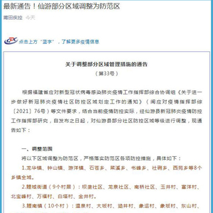 原标题:福建莆田仙游部分区域调整为防范区 来源:中工网
