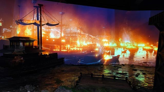 展览的最后是星落五丈原展项,动画中,远方山峦叠嶂,空中风声戚戚,星光黯淡,诸葛亮在座椅上,孤独地遥望北方,不知是否为无法实现兴复汉室、还于旧都的愿望而遗憾,留下一个让人感叹良久的背影。随着时光的流逝,刘备与诸葛亮这一对明君良臣都已成为历史,他们曾共叙经纬,他们曾挥剑指北,他们曾山水跋涉,他们最后却只能长揖作别……这一展项让该展览留下一个极为动人的结尾。