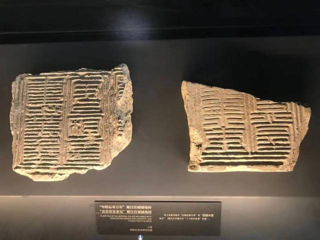 公元221年,刘备称帝于成都武担山之南,并建都于成都,后修建蜀汉宫城。在汉代,大型建筑的地面往往用砖铺砌,起到防潮、防滑以及美观等功效。在天府广场东北侧、今四川大剧院附近一带,曾发现大量铺地砖,在踏面上模印了纹饰,还有“富贵昌”“爵禄尊”“宜宫堂”“寿万年”等吉祥用语。考古人员认为这是蜀汉时期的一处高等级建筑,可能就是蜀汉皇宫。本次展览展出此遗址出土的“勿相忘寿万年”铺地砖和“宜宫堂宜弟兄”铺地砖,不仅表达了追求长寿、吉祥、圆满的美好愿望,还作为宫城的一部分,供人想象蜀汉皇宫曾经的面貌,这这几句吉语更让展览和国庆大假非常合拍。
