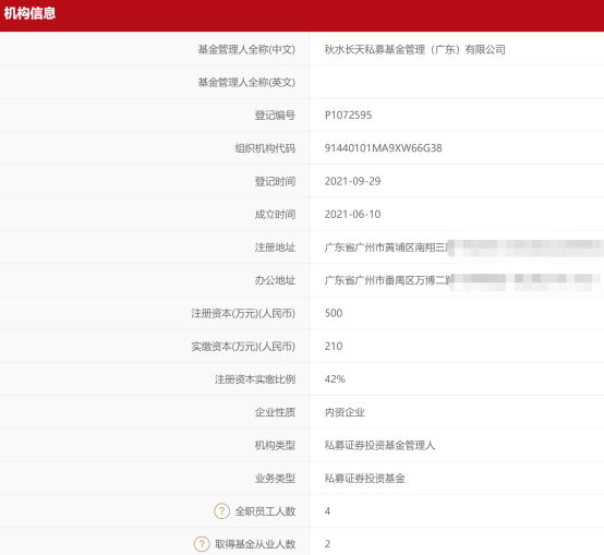 基金业协会信息显示,今年9月29日,“秋水长天私募基金管理(广东)有限公司”完成备案登记,机构类型是私募证券投资基金管理人。这家新锐私募成立于今年6月10日,注册资本500万元,目前公司有4名全职员工,注册和办公地都在广州市。