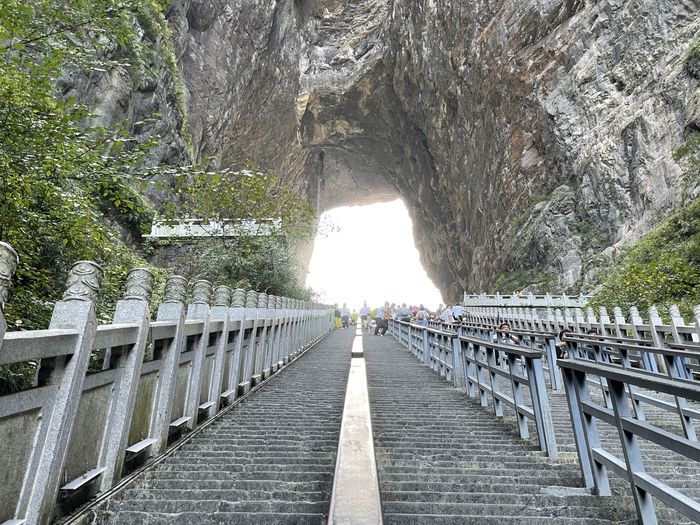 在登临天门洞的必经之路,共999级台阶的“上天梯”景点,两位来自四川的游客表示,他们一早坐航班飞到张家界,直接就来爬天门山了。两人表示,在他们心中,张家界是一个旅游出名的城市,他们工作一年多,现在国庆一放假就来了。