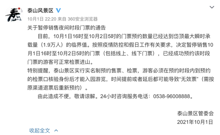 按照疫情防控和假日工作有关要求,决定暂停销售10月1日16时至10月2日5时的门票(包括线上、线下门票),已经成功预约该时段门票的游客可正常检票进山。