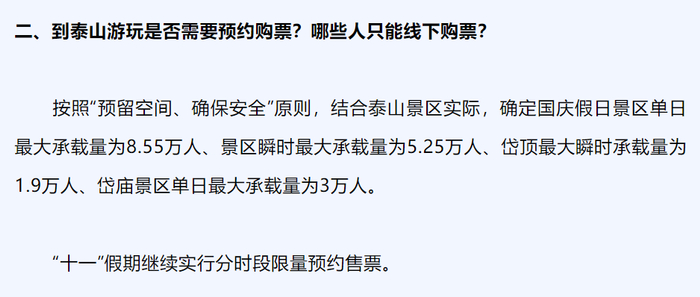 在十一黄金周前,泰安日报发布旅游注意事项,按照“预留空间、确保安全”原则,结合泰山景区实际,确定国庆假日景区单日最大承载量为8.55万人、景区瞬时最大承载量为5.25万人、岱顶最大瞬时承载量为1.9万人、岱庙景区单日最大承载量为3万人。