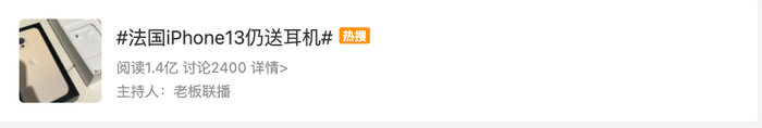 10月1日,一则#法国iPhone13仍送耳机#的话题冲上热搜。截至发稿,目前该话题的阅读量达到了1.4亿次。