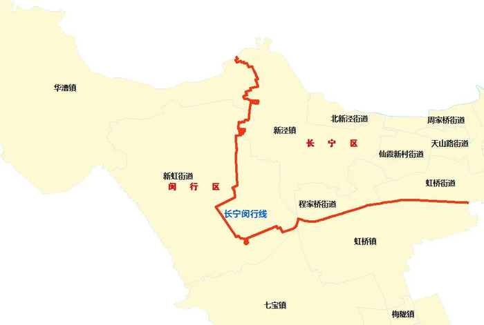 沿线涉及长宁区的新泾镇、程家桥街道、虹桥街道和闵行区的华漕镇、新虹街道、虹桥镇。