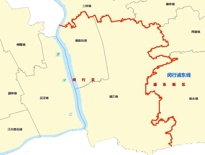 “闵浦线”是闵行区与浦东新区两区行政区域界线的简称,大致为南北偏西走向。西起徐汇区、闵行区、浦东新区三区边界交汇点,沿线大致经芦恒路、林浦南路、临太路、三彩路、林恒路、林海公路、年家浜路、沈杜公路、申嘉湖高速、汇驰路、闸航路、林海公路,南至闵行区、浦东新区、奉贤区三区边界交汇点,全长56.2公里,边界线代码为“1215”。