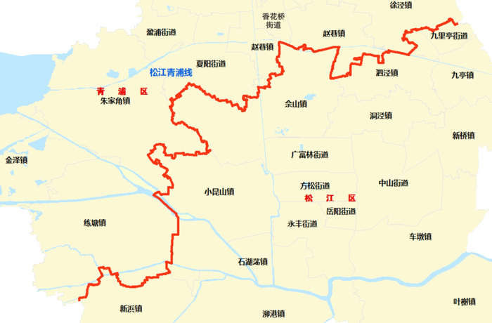 沿线涉及松江区的新浜镇、石湖荡镇、小昆山镇、佘山镇、泗泾镇、九亭镇、九里亭街道和青浦区的练塘镇、朱家角镇、夏阳街道、赵巷镇、香花桥街道、徐泾镇。