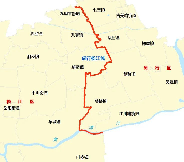 沿线涉及闵行区的江川路街道、吴泾镇、浦江镇和奉贤区的庄行镇、西渡街道、金汇镇。