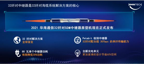 作为业内首个Petabit级别的钛合金海底光通信中继器,32纤对中继器基于现有成熟平台相较上一代实现了100%的纤对数提升:在电学方面优化了电路设计来提高转化效率,有效降低30%的功耗;在结构设计上,优化光路和电路结构,采用全新的集成式光单元,在保证散热能力的同时大幅节省了60%空间。目前,该产品已完成实验室测试验证并预计在2022年正式商用。