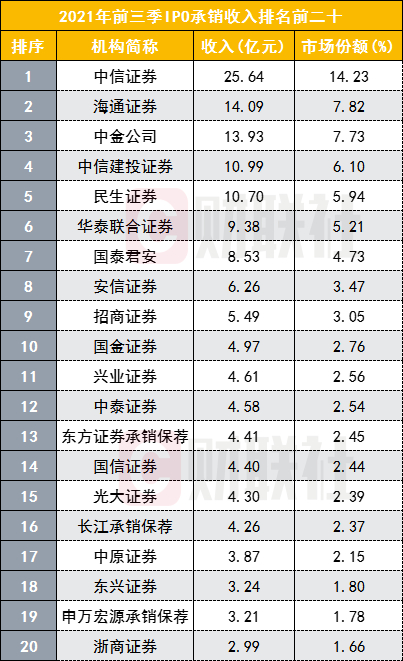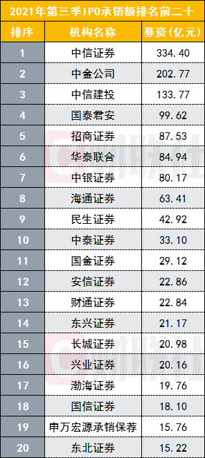数据统计显示,2021年第三季度,中信证券以12.67亿元居行业首发承销收入排名首位;TOP10中其他九家券商分别是中信建投(5.90 亿元)、国泰君安(4.23亿元)、中金公司(3.36亿元)、招商证券(2.69亿元)、中银证券(2.26亿元)、民生证券(1.81亿元)、中泰证券(1.80亿元)、华泰联合(1.73亿元)、海通证券(1.70亿元)。