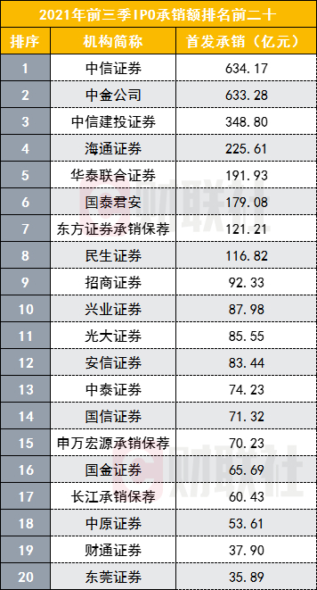 Wind数据显示,以IPO上市日统计,今年前三季度,首发承销保荐金额居前十的券商分别是,中信证券(634.17亿元)、中金公司(633.28亿元)、中信建投证券(348.80亿元)、海通证券(225.61亿元)、华泰联合证券(191.93亿元)、国泰君安(179.08亿元)、东方证券承销保荐(121.21亿元)、民生证券(116.82亿元)、招商证券(92.33亿元)、兴业证券(87.98亿元)。