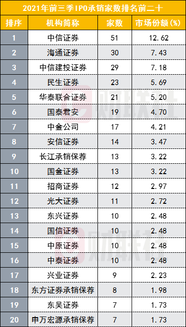 东财Choice数据统计显示,截至9月30日,2021年第三季度,首发承销家数前十的券商分别是中信证券(22家)、中信建投(9 家)、中金公司(8 家)、民生证券(8 家)、国泰君安(7 家)、海通证券(6 家)、国金证券(5 家)、安信证券(5 家)、东兴证券(5 家)、中泰证券(4 家)。