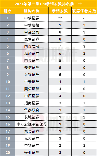 中信证券是唯一一家在第三季度IPO承销家数双位数券商,民生证券依然保持 “黑马”本色,承销家数行业排名第四。