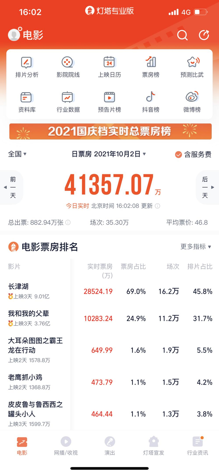 截至10月2日16点,《长津湖》票房已突破9亿,今晚很可能突破10亿大关,《我和我的父辈》票房也达到了3.76亿。