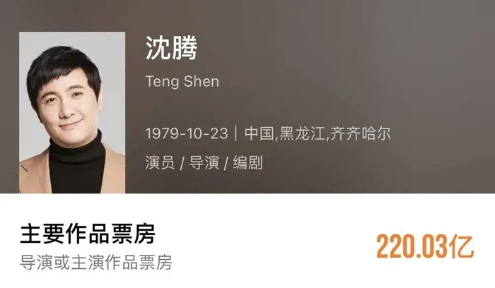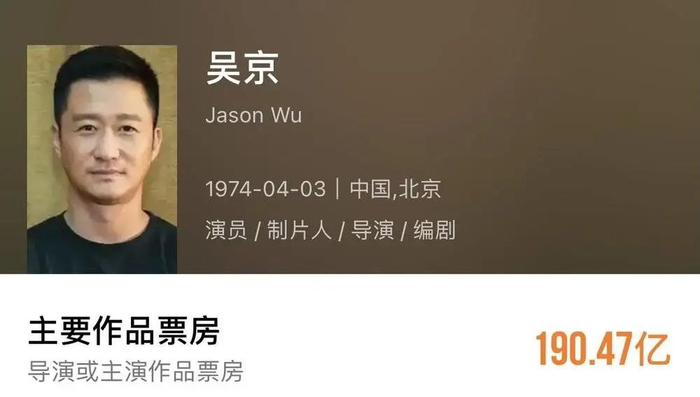 根据灯塔专业版数据,截至发稿,吴京的个人主要电影票房为190.48亿,跟总票房第一的沈腾还有30亿的差距,后者主演或导演的票房累计为220.03亿。