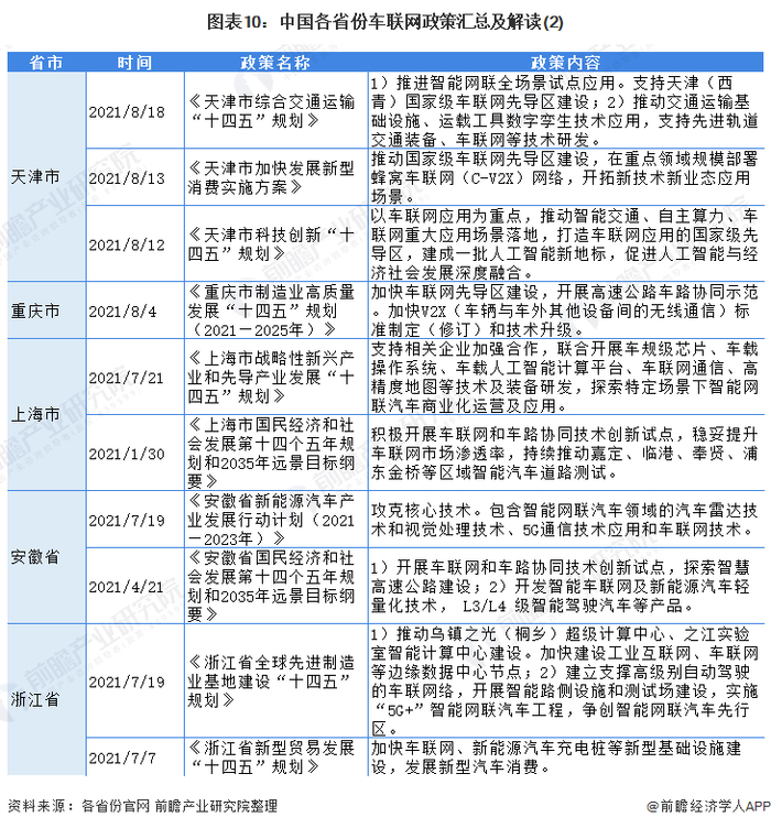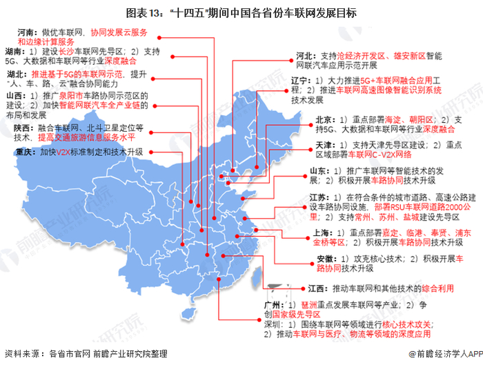 目前,根据《“十四五”规划纲要和2035远景目标纲要》,“十四五”期间,我国将积极稳妥发展车联网。现有或规划进行车联网先导区建设的省份包括:江苏、湖南、天津、浙江、广东和北京,各省份均在“十四五”时期发布了推动车联网建设的支持性政策,政策内容均落实了“支持重点城市率先进行车联网先导区建设”;此外,湖南、北京和天津等省市均就车联网与其他领域如工业互联网、5G和大数据进行融合协同发展的部署说明,积极推动车联网应用: