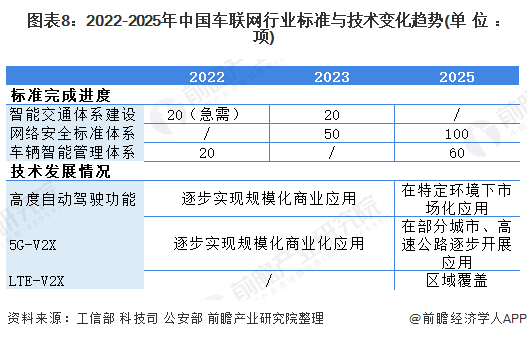 根据工信部等部门颁布政策显示,截止2022年年底,车联网产业需完成车辆智能管理体系重点指标20项、智能交通相关急需指标20项;技术方面,高度自动驾驶功能和5g-V2X技术逐渐实现规模化商业化应用。截止2023年,完成车联网产业网络安全标准指标50项、智能交通相关重点指标20项。截止2025年,车联网产业完成网络安全相关指标100项和车辆智能管理指标60项;技术方面,高度自动驾驶功能在特定环境下可以进行市场化应用,而5G-V2X技术则可逐步开展应用,LTE-V2X技术实现区域覆盖。