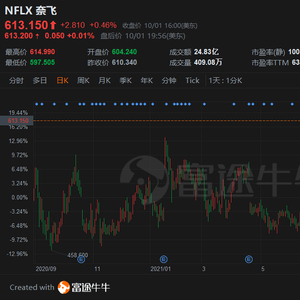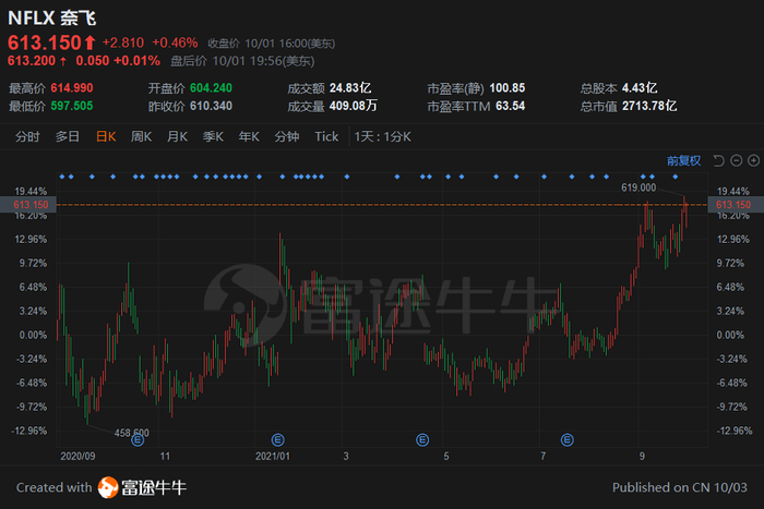 周五,Netflix股价以613.15美元收盘,其在过去几天《鱿鱼游戏》大火以来已经涨超4%,年初至今已经涨近20%。
