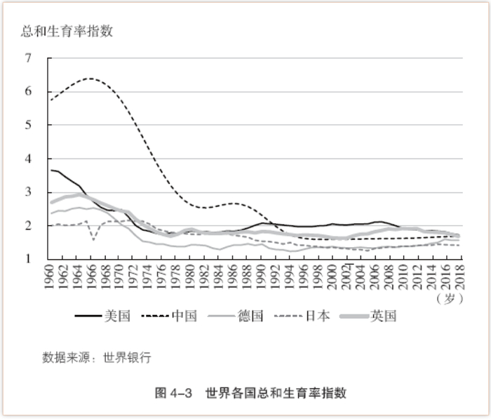 在这条曲线上,中华民族新生儿的高峰——或者用西方的概念来讲叫作婴儿潮(babyboomer)——来得比西方更晚一些。美、欧、日社会的婴儿潮都是出现在二战结束之后,从1946年到1962年左右,日本结束得早一些,欧洲、美国结束得晚一些;而中国的婴儿潮出现在1963年到1970年,当时中国每年大约生育3000万个孩子,从20世纪70年代初开始出生率一路下跌。