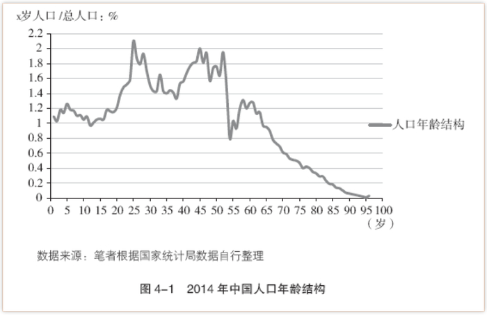 根据第六次人口普查(注:本书成稿时第七次人口普查数据尚未公布)所揭示的中国各个年龄段人口数量分布,以此为底层数据进行推算,将2014年当期生存的中国人按年龄段分层计数,连接所得的数据即得到中国当下的人口指数曲线。