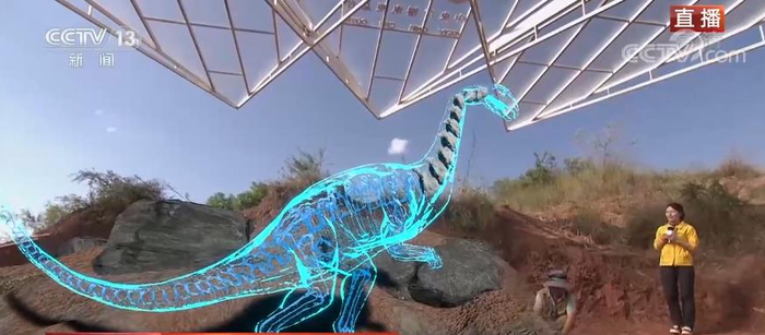 央视网消息:为了能够更好地呈现科学发现的细节,也为了让您更能身临其境感受侏罗纪世界,我们在前方也特别搭建了沉浸式混合现实系统,在科考现场就能实时看到根据骨骼化石复原的恐龙模样,实现野外互动直播。一眼穿越亿万年。