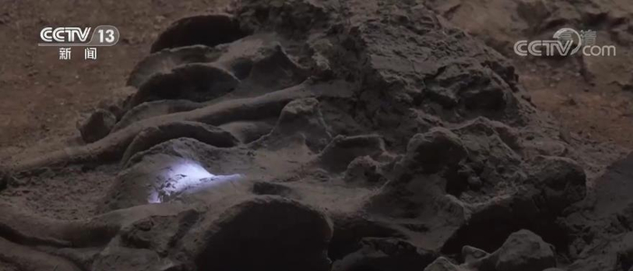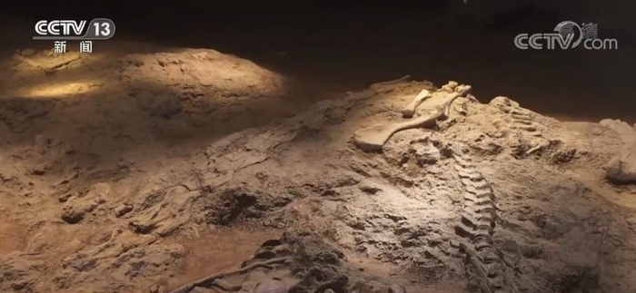 禄丰市恐龙化石保护研究中心主任 王涛:我的推断当时川街龙正在吃植物,这条肉食龙就偷偷的跑到它后面来进攻,有可能是几条一起来,这一条正好在它的屁股附近进攻,那么,(阿纳川街龙)刚好倒地,就把这一条是肉龙压在下面去了。