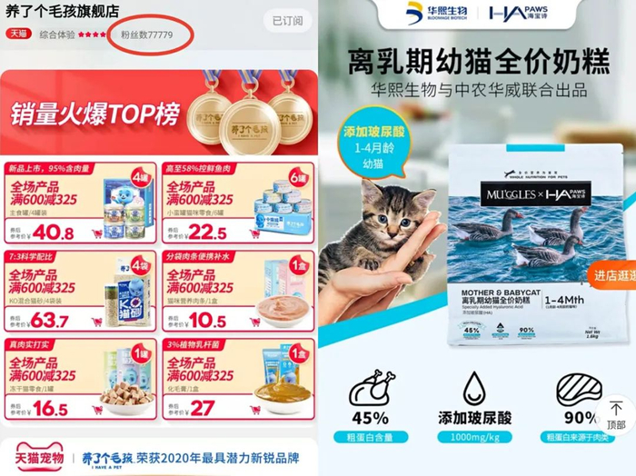 除了“纯正宠物股”之外,三只松鼠、华熙生物等也已跨界入局。其中,三只松鼠于2020年7月正式推出旗下首个宠粮品牌“养了个毛孩”,目前其天猫旗舰店粉丝已近8万。玻尿酸龙头华熙生物则推出了玻尿酸宠物粮,商品详情页显示,添加玻尿酸将具有润滑关节、延缓衰老、美肤靓毛、健康肠胃、提升免疫等五大优势。