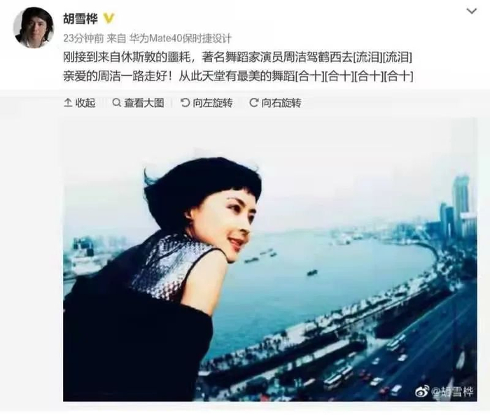 上午,导演胡雪桦于社交媒体表示:“刚接到的噩耗,著名舞蹈家、演员周洁驾鹤西去。亲爱的周洁一路走好!从此天堂有最美的舞蹈。”一石激起千层浪,“最美贵妃”“东方美神”曾经的音容笑貌再次展示在大众的面前。